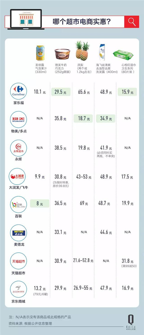 值得指出的是,除了麥德龍和物美承諾“線上線下統(tǒng)一價(jià)格”之外,其他幾家的門店和電商都不能保證一致的價(jià)格。