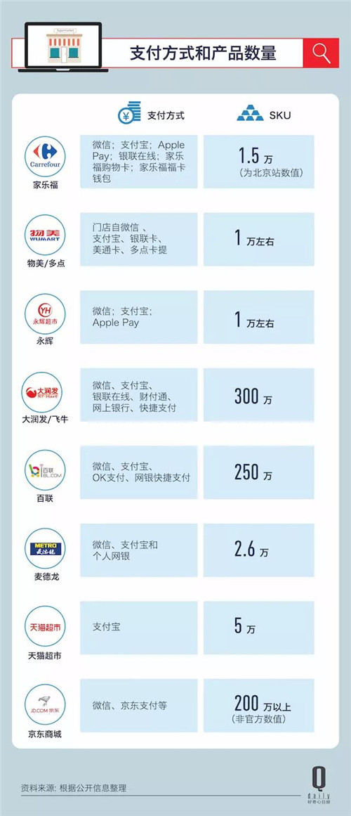 百聯(lián)電商和飛牛網(wǎng)更像京東商城或亞馬遜那樣的線上超市+百貨,SKU (據(jù)說)是百萬級(jí)別的。家樂福、麥德龍、永輝和物美/多點(diǎn)則更接近傳統(tǒng)意義上的大賣場超市,以食品和日化用品為主,SKU 在1~2 萬。
