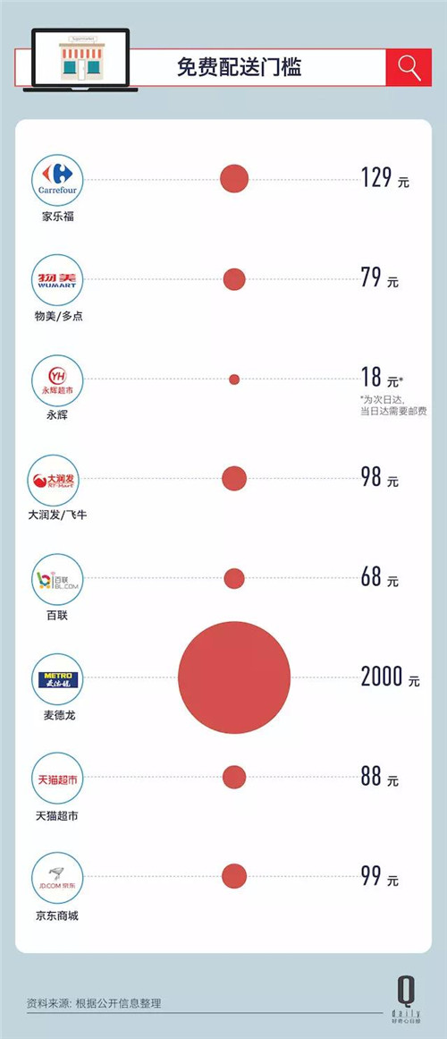 另外一個(gè)問題是生鮮免費(fèi)配送門檻比較高(和普通商品同價(jià))。比如,百聯(lián)需要 68 元,飛牛需要 98 元。其實(shí),包括更成熟的天貓超市和京東也有類似的問題,分別需要滿 88 元和 99 元才能免郵費(fèi),生鮮電商天天果園的包郵門檻也要 68 元。