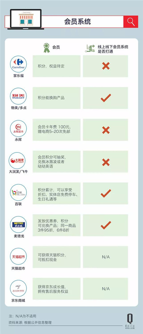 另外永輝、家樂福以及飛牛網(wǎng)(網(wǎng)上大潤發(fā))的線上線下會(huì)員體系都沒有打通。如果是打算做客群來留住消費(fèi)者,打通會(huì)員體系還是比較重要的。