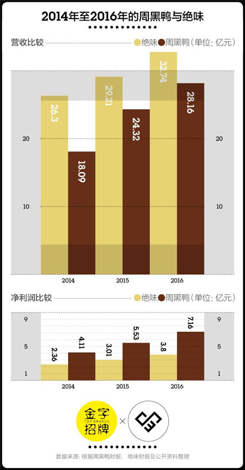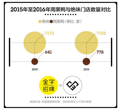 近兩年的市場(chǎng)表現(xiàn)沒(méi)有讓潘攀失望。根據(jù)咨詢公司弗諾斯特沙利文的數(shù)據(jù),中國(guó)休閑鹵制品零售總額從2010年的232億元增長(zhǎng)至2016年的637億元,年均復(fù)合增長(zhǎng)率為18.5%。截至2016年12月31日,周黑鴨全年?duì)I收約為28.16億元,較去年同期的24.32億元增長(zhǎng)15.8%。雖然778家的門(mén)店數(shù)量只有絕味的1/10左右,但周黑鴨的利潤(rùn)率是絕味的2倍多。