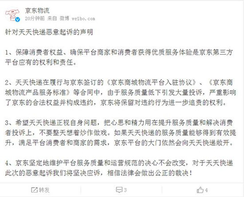 京東物流方面深夜回應(yīng)天天快遞傍晚的起訴聲明。