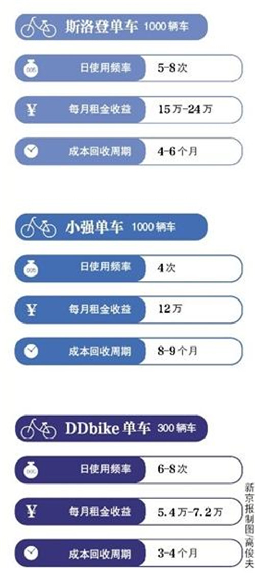 另一個來自成都的DDbike則稱,以15萬人口的縣城為例,投放300輛車,資金約13.8萬,客戶端軟件的使用費(fèi)用3萬,成本總計18萬元,每輛車的日均使用頻率為6-8次,以此計算3至4個月就可收回投資本金。