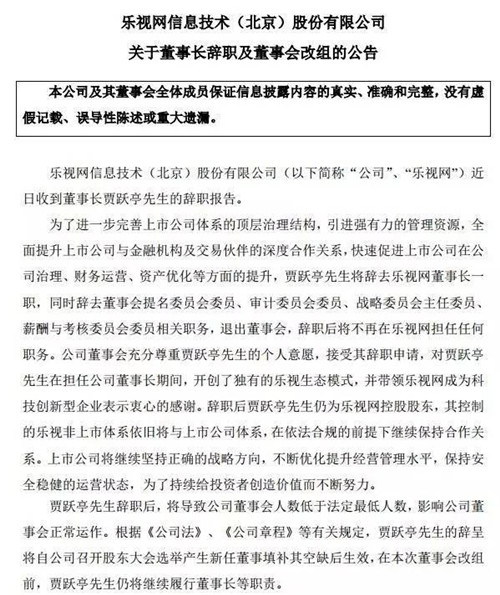 今天賈躍亭老師辭去樂視網董事長一職,同時辭去董事會提名委員會委員、審計委員會委員、戰(zhàn)略委員會主任委員、薪酬與考核委員會委員相關職務,退出董事會,辭職后將不再在樂視網擔任任何職務。