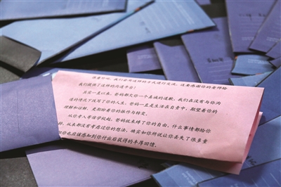 而最棘手則是一些父母與孩子之間有一些矛盾,“我們班一個(gè)男生因?yàn)楦咧袝r(shí)候爸媽管他管得太緊,以至于跟他們之間產(chǎn)生了很大的矛盾,他的父母知道有這樣一個(gè)可以給孩子寫信的機(jī)會(huì)之后,雖然很高興,但是也憂心忡忡,害怕孩子不愿意看他們的信,或者會(huì)因?yàn)檫@封信措辭不合適而加深對(duì)他們的誤解。我開導(dǎo)了他們很久,他們才愿意寫一封信,希望可以解開這個(gè)心結(jié)?!标惱蠋煴硎?,這位同學(xué)的父母寫的信更像是一封和解信,在字里行間的深深愧疚中,她也感受到了家長(zhǎng)對(duì)于孩子的無奈和那一顆期望孩子快樂的心。