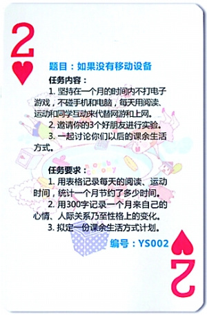 趙伊湄抽到了“紅桃2”。作業(yè)題目是:如果沒有移動設備,同時給出了三項任務,要求在一個月內(nèi)不打電子游戲,不碰手機和電腦,每天用閱讀、運動和同學互動代替網(wǎng)游和上網(wǎng)。
