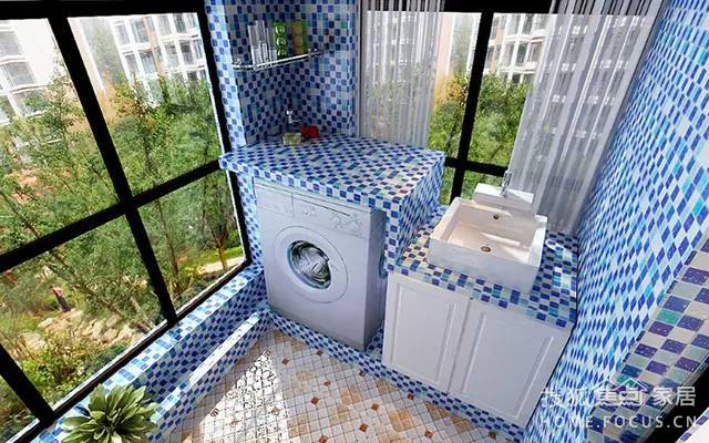 這一款讓人眼前一亮的陽臺(tái)放洗衣機(jī)效果圖便是地中海風(fēng)格陽臺(tái),戶主大膽采用藍(lán)白相間的馬賽克墻面,配合白色的洗衣機(jī)組合柜和洗手池,給人一種置身海邊的感覺。由于陽臺(tái)兩面都是落地窗,戶主便在轉(zhuǎn)角的墻面上設(shè)了一個(gè)置物架,用來放洗手液、洗衣液、洗面奶等用品,使用起來十分方便。