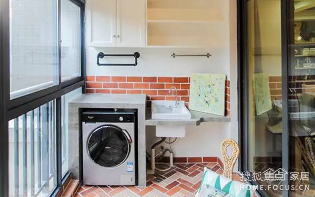 這是一款青春活潑的陽臺(tái),地面和墻面都是復(fù)古紅磚風(fēng)格,加上配合洗衣機(jī)的盥洗區(qū)下方的管道直接暴露出來,顯得十分自由隨意,洗衣機(jī)上方懸掛的兩個(gè)晾曬架,可以用來掛毛巾、小衣物等,這樣的陽臺(tái)洗衣機(jī)角落實(shí)用又有格調(diào),適合年輕人。