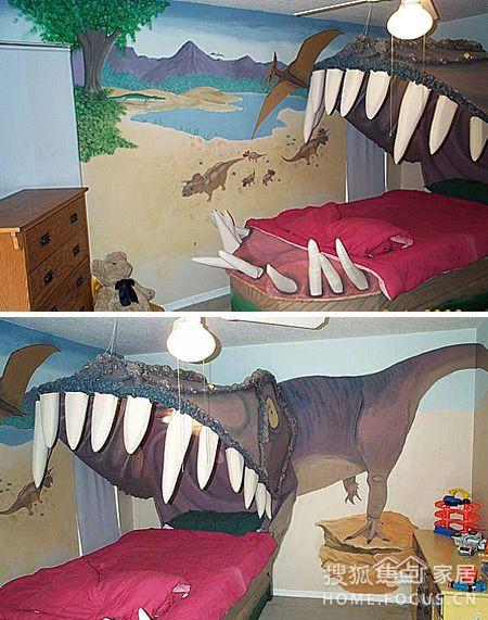 這是一個(gè)自帶3D效果的臥室床頭背景墻,從正面看還以為只是一只大恐龍。從側(cè)面我們看到的卻是一個(gè)突出的恐龍嘴。不知道躺在這樣的床上是怎樣的感覺(jué)。