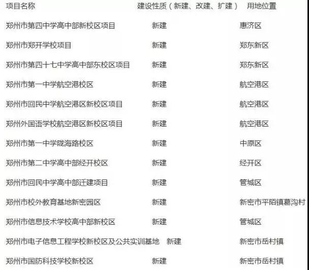 表格中顯示的學(xué)校鄭州一中、鄭州外國(guó)語(yǔ)學(xué)校等知名中學(xué)的新校區(qū),家里有孩子該上學(xué)的朋友趕緊看看你家附近有沒(méi)有學(xué)校要新建!