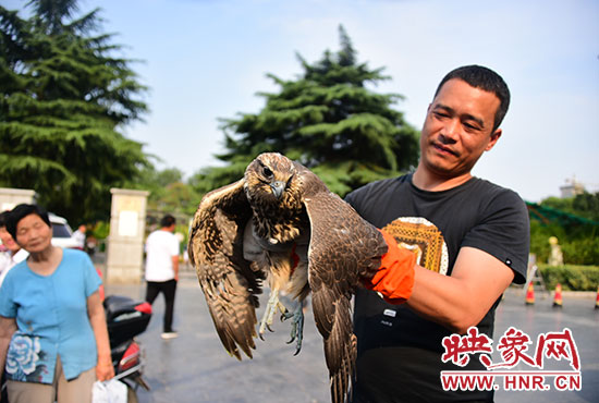 在人民公園西門(mén),當(dāng)獵隼從紙箱里拿出時(shí),霸氣十足威風(fēng)凜凜的它便引來(lái)了眾多市民的圍觀,有人猜是老鷹,有人猜是貓頭鷹。