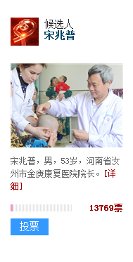 映象網(wǎng)汝州訊(記者 楊增強(qiáng))河南仁醫(yī),感動(dòng)中國!映象網(wǎng)記者12月26日獲悉,“感動(dòng)中國”2017年度候選人物已經(jīng)投票已經(jīng)開始,由河南省委宣傳部選報(bào)的我省候選人汝州市金庚康復(fù)醫(yī)院院長宋兆普入圍,網(wǎng)友可關(guān)注央視網(wǎng)投票頁面(點(diǎn)擊下圖)為這位河南仁醫(yī)進(jìn)行投票。