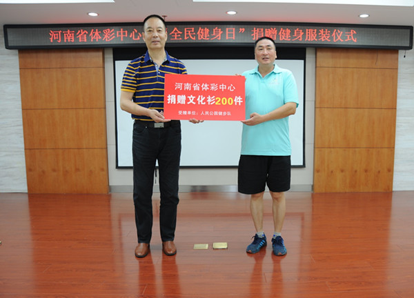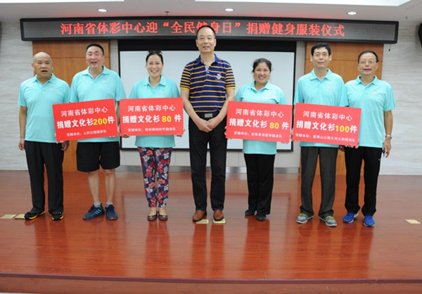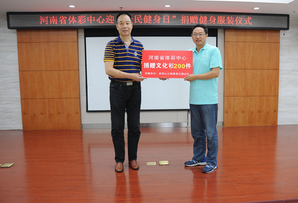 今年的8月8日將迎來我國第8個“全民健身日”,為了有力支持我省的全民健身工作,滿足廣大人民群眾日益增長的健身需求,河南省體育彩票管理中心于7月29日上午向社會團體和今年我省“全民健身日”主題活動舉辦地捐贈了3000件體恤衫,并在河南體彩中心會議室舉行了簡短的捐贈儀式。