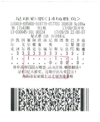 南陽(yáng)年輕彩民中足球彩票(14場(chǎng)勝負(fù))46萬(wàn)余元