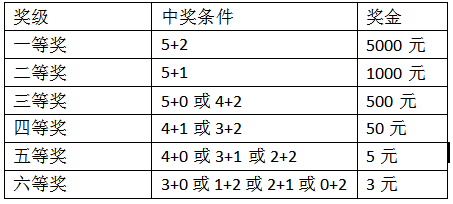 一等獎(jiǎng):投注號(hào)碼與“樂(lè)善碼”的5個(gè)前區(qū)號(hào)碼(順序不限,下同)和2個(gè)后區(qū)號(hào)碼(順序不限,下同)相同,即中獎(jiǎng),獎(jiǎng)金為5000元;