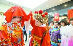 大紅花轎、鳳冠霞帔、媒婆丫鬟……昨天上午,重慶人民廣場上,喜慶的鑼鼓、嗩吶聲吹得熱鬧,一支特殊的迎親隊伍引來了眾多市民的圍觀。