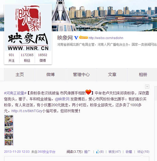 “老漢錢(qián)被盜,鄭州市民網(wǎng)友義買(mǎi)粉條”微博發(fā)布于2013年11月19日,當(dāng)天,映象網(wǎng)記者在街頭采訪,偶遇中牟縣的一位農(nóng)家老漢與老伴到鄭州賣(mài)粉條,不料騾子被偷,錢(qián)也被盜。映象網(wǎng)迅速發(fā)布新聞,并連續(xù)發(fā)布多條微博,呼吁市民網(wǎng)友伸出援手幫助兩位老人,迅速引發(fā)關(guān)注,短時(shí)間內(nèi)轉(zhuǎn)發(fā)量超過(guò)200次,閱讀量接近20萬(wàn)次,引發(fā)眾多愛(ài)心市民網(wǎng)友前往購(gòu)買(mǎi)粉條,400多斤粉條在兩個(gè)小時(shí)內(nèi)被搶購(gòu)一空,丟失的騾子也成功找回。