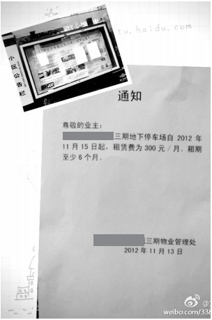 他稱將盡快對微博上的投訴進行回復,以消除通知帶來的影響和誤會,同時將收集業(yè)主意見,慎重考慮停車位費用問題。