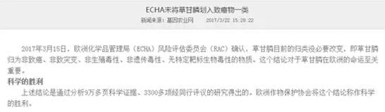 據(jù)中國經(jīng)濟(jì)網(wǎng)記者了解,今年3月15日,歐洲化學(xué)品管理局(ECHA)風(fēng)險(xiǎn)評(píng)估委員會(huì)(RAC)也正式確認(rèn)了確認(rèn)草甘膦為非致癌物。