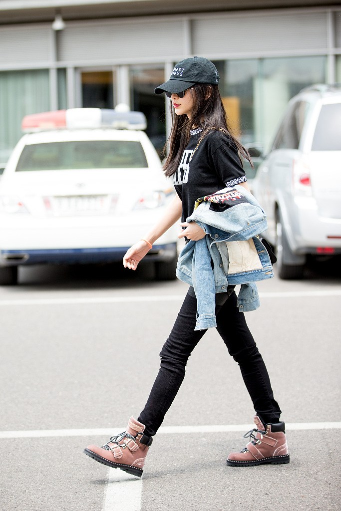 Baby全黑出街"微笑唇"點(diǎn)睛 雙腿細(xì)長直
