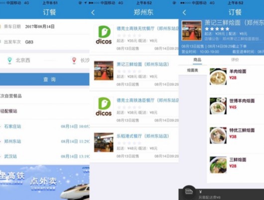 基于手機高鐵購票APP,消費者打開之后轉(zhuǎn)到商旅服務一欄找到訂餐服務,在上面輸入乘車日期和車次之后就能選擇餐點,再填寫姓名和座位號等信息,付款成功之后就能“坐等”外賣送達手中。