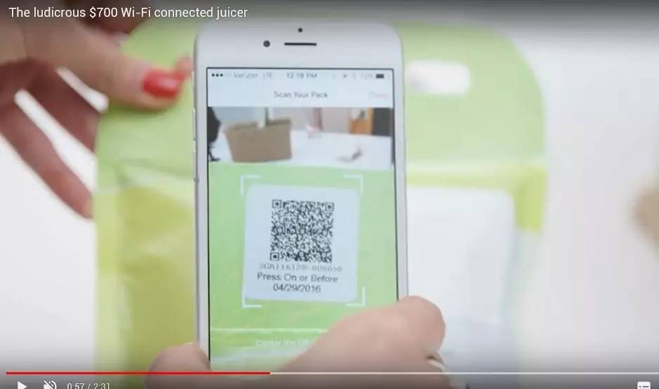 此外,這些主打互聯(lián)網(wǎng)概念的“果汁材料包”還有二維碼可供掃描。用戶掃碼之后,手機(jī)上可顯示出材料包內(nèi)商品的生產(chǎn)信息。并且聯(lián)網(wǎng)后的智能榨汁機(jī)還可以讀取這些信息。如果有變質(zhì)、過(guò)期的不新鮮材料包被投入機(jī)器,榨汁機(jī)將拒絕工作。