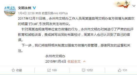湖南省永州市文明辦官方微博:2017年12月11日晚,永州市文明辦工作人員周某擅自用文明辦官方微博為其喜歡的明星“打call”,引發(fā)網(wǎng)友關(guān)注與熱議。針對(duì)周某違規(guī)使用單位官方微博的行為,永州市文明辦對(duì)其進(jìn)行了嚴(yán)肅的批評(píng)教育和誡勉談話,責(zé)成其寫(xiě)出深刻書(shū)面檢討,周某本人也已認(rèn)識(shí)到了自己的錯(cuò)誤。