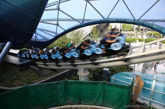 記者一行跟隨導(dǎo)覽員先來到了“極速光輪”區(qū),這是一個(gè)非常受游客追捧的項(xiàng)目,有些類似過山車,但視覺、聽覺和感官的沖擊力遠(yuǎn)比過山車強(qiáng)烈。雖然時(shí)間還早,但進(jìn)口處已經(jīng)排著長長的隊(duì),提示等候時(shí)間為2小時(shí)40分鐘。