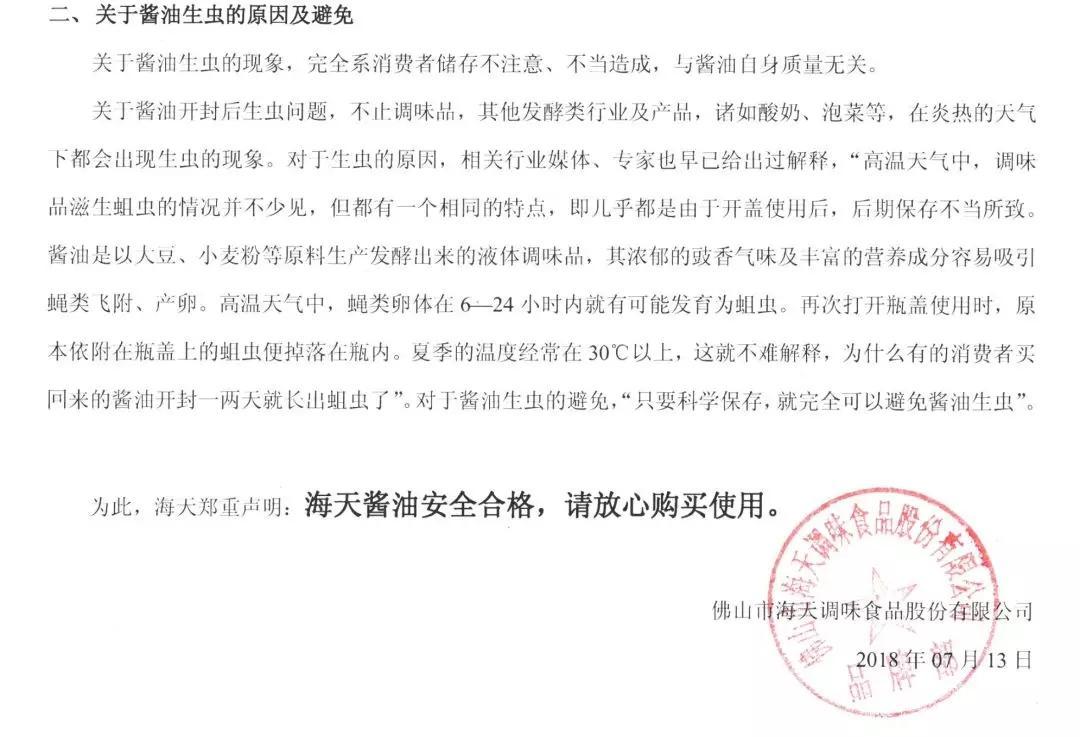 7月13日,海天味業(yè)在其官網(wǎng)發(fā)布“海天醬油安全合格,請放心購買使用”聲明。聲明稱,海天味業(yè)出場的產(chǎn)品均按照國家標(biāo)準(zhǔn)生產(chǎn),在出廠前均經(jīng)過檢驗合格。因此,未開封的產(chǎn)品不會有活蟲和蟲卵生長。至于醬油開封后出現(xiàn)蛆蟲,海天味業(yè)解釋說,不止調(diào)味品,酸奶、泡菜等發(fā)酵產(chǎn)品在炎熱的條件下也容易生蟲。而醬油生蛆“完全是消費者儲存不當(dāng)造成,與醬油自身質(zhì)量無關(guān)”。