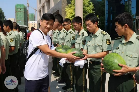 我們給他們每人都送了一個西瓜,遞到他們手里跟他們說:“你們辛苦了!”的時候,我們明顯能夠感覺到他們的喜悅,他們飽經(jīng)風(fēng)霜的臉上洋溢的笑容,讓人覺得特別溫馨、真誠。