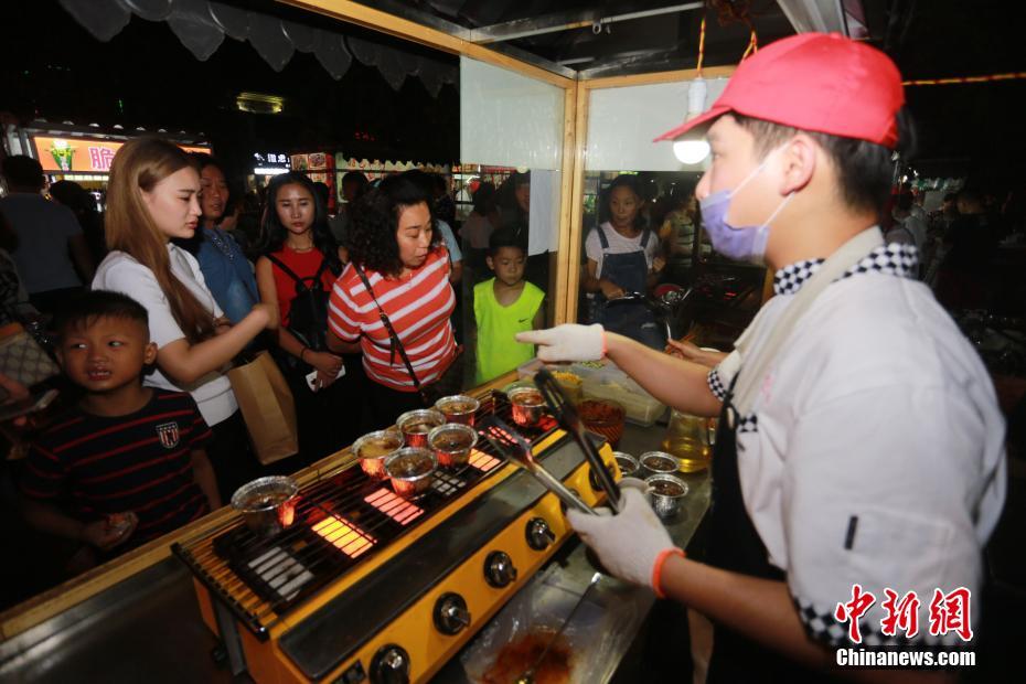 9月17日,顧客排隊(duì)在購買“烤腦花”。在掌握了技能后于6月初回到家鄉(xiāng)河南漯河市文化路夜市開起了漯河首家“不靠譜烤腦花”。
