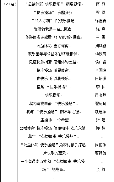 經(jīng)過一個(gè)多月的征文和評(píng)選工作,由大河報(bào)與省體彩中心聯(lián)合舉辦的我與“公益體彩 快樂操場(chǎng)”有獎(jiǎng)?wù)魑幕顒?dòng)圓滿結(jié)束,本次活動(dòng)共評(píng)出一等獎(jiǎng)1名、二等獎(jiǎng)5名、三等獎(jiǎng)10名、優(yōu)秀獎(jiǎng)20名以及9個(gè)集體獎(jiǎng)項(xiàng),隨后將舉行頒獎(jiǎng)儀式對(duì)獲獎(jiǎng)?wù)哌M(jìn)行表彰。