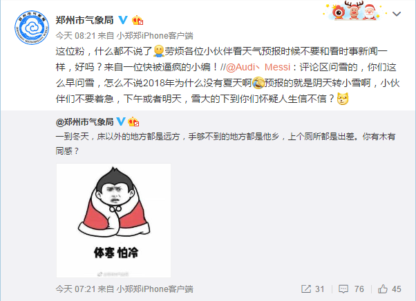 眾多網(wǎng)民發(fā)現(xiàn)不能玩雪,于是組隊去玩“鄭州市氣象局”了。在“鄭州市氣象局”的新浪微博上,網(wǎng)友有的調(diào)侃,有的逼問,把氣象局的小編已經(jīng)“逼瘋”。目前,該小編已經(jīng)開始在微博上暴走,每小時更新一次微博,并且和每位回復的粉絲“較真”的討論起這讓人瘋狂的“暴雪”為什么還不來。