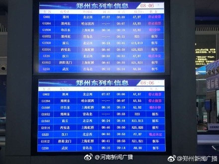 【暴雪導致部分列車停運】1月4日,記者從鄭州東站了解到,受冰雪影響,途徑鄭州東站的14趟列車停運,具體車次如下(以下列車均為往返車次):