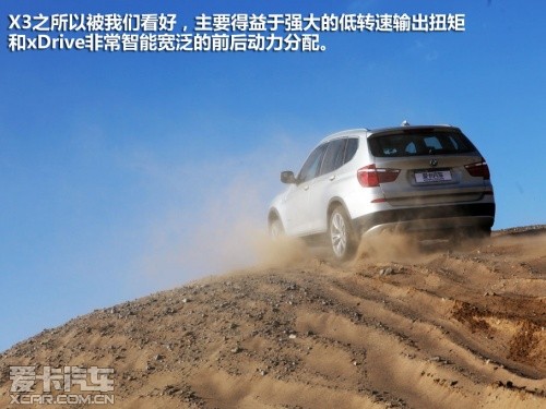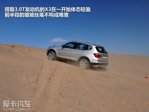 或許是奧迪Q5完成測試的過程比較順利,我們對接下來即將登場的寶馬X3也普遍比較看好,這或許就是思維慣性帶來的固定套路吧。然而在實地測試過程中,這臺X3攀爬沙丘的過程卻沒有表現(xiàn)出它在公路上所煥發(fā)出的霸氣。400?!っ椎淖畲笈ぞ卦诔鞘械缆分?,甚至在高速公路上都是無與倫比的,但移步至眼前狂風(fēng)大作的沙丘,這400?!っ椎呐ぞ貏t像是心有余而力不足的悲情英雄。