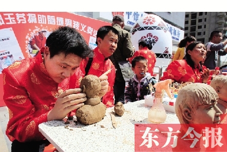 4月13日,在鄭州市秦嶺路一廣場,幾位民間藝人發(fā)起為腦癱患兒小晨陽募捐的義賣活動,造型各異的面人、神氣活現(xiàn)的泥塑、精致逼真的葫蘆烙畫……這些久違的民間藝術(shù)品受到市民熱捧,一個小時募捐了3667元。