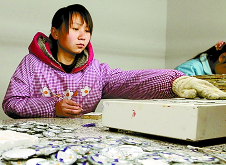 信陽市平橋區(qū)明港鎮(zhèn)大營村利用城郊地理優(yōu)勢,通過招商引資吸引外來投資3億多元。圖為3月27日,村民正在村里的合盛五金飾品加工廠制作徽章。 河南日報記者 鄧 放 攝