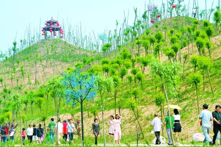 當(dāng)日上午,省市有關(guān)領(lǐng)導(dǎo)共同為沈丘“中華槐園”舉行隆重的揭牌、開園儀式,標(biāo)志著中華槐園正式對(duì)外開放。隨后,游客們?cè)凇盎眻@”中參觀、賞樹(如圖),看著滿眼的紅花槐、白花槐、紫花槐,還有黃金槐、龍爪槐、五葉槐等,紛紛拿起相機(jī),將這滿園美景盡收其中。