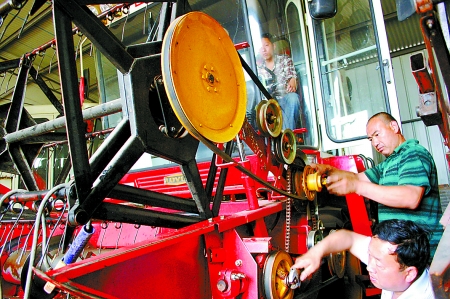 5月7日,武陟縣農(nóng)機局的技術(shù)人員正在幫助農(nóng)機手檢修小麥?zhǔn)崭顧C?!叭摹迸R近,武陟縣農(nóng)機局組織技術(shù)人員深入鄉(xiāng)村,對全縣參加跨區(qū)作業(yè)的800多臺小麥聯(lián)合收割機進行全面檢修,并對機手進行安全操作技能培訓(xùn),做好參加跨區(qū)麥?zhǔn)铡皶?zhàn)”的準(zhǔn)備。 馮小敏 李福利 攝