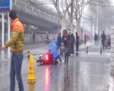附近一名環(huán)衛(wèi)工稱,昨日凌晨,有泔水車經(jīng)過,將泔水油灑了一地,夜里凍成一條冰帶,早上很多人在這里摔倒,他就親眼看見,一個(gè)多小時(shí)有四五十輛電動(dòng)車翻倒。