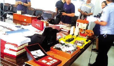 在警方展示贓物的現(xiàn)場,各種玉石、陶瓷、珠寶、金表、類似兵馬俑的古董、冬蟲夏草、古書、紀念幣、郵票、筆記本電腦、平板電腦等滿滿一桌子物品著實讓人看得眼花繚亂。