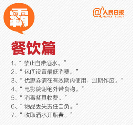 消協(xié)指出,影院禁帶食品屬霸王條款?!安蛷d禁止自帶酒水”“包間最低消費xx元”“一經(jīng)售出,概不退換”“本方擁有最終解釋權(quán)”“物品丟失本店概不負責”……熟悉吧?都是霸王條款!如果遇到,果斷打12315投訴,再不忍氣吞聲!為自己擴散