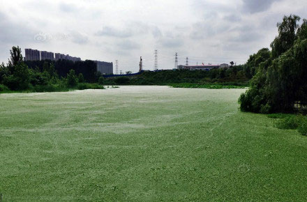這不是草地,這是西流湖。近段時間,鄭州西流湖多次遭受污染,除了湖面瘋長的浮萍外,大量死魚還漂浮在湖面上。