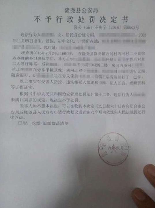 被害人家屬翻拍的一份由隆堯縣公安局對其中一名肇事學(xué)生開具的不予行政處罰決定書。7月24日下午,河北省邢臺市隆堯縣堯山中學(xué)一名初一學(xué)生,因為不愿意借錢而在補習(xí)班遭受了兩名女生長達4分鐘的辱罵、毆打,另一名學(xué)生還把整個過程用手機拍攝下來并上傳網(wǎng)絡(luò),視頻在當(dāng)?shù)乇化偪駛鞑ァ?/p>