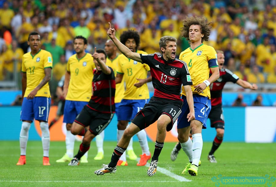 北京時間7月9日凌晨4時,2014年巴西世界杯首場半決賽在貝洛奧里藏特的米內(nèi)郎體育場進行,東道主巴西迎戰(zhàn)上屆季軍德國。最終,德國隊憑借在18分鐘內(nèi)連入5球的攻擊狂潮以及下半場許爾勒替補登場后的梅開二度,7-1超大比分淘汰巴西,昂首晉級決賽。第10分鐘,穆勒利用角球機會首開紀錄。第22分鐘,克洛澤門前兩連擊攻入世界杯第16球,超越羅納爾多,成為世界杯進球第一人。第24分鐘和第25分鐘,克羅斯1分鐘內(nèi)連入2球。第28分鐘,赫迪拉又接厄齊爾傳球打進一球。第68分鐘,許爾勒又接拉姆助攻,門前包抄打門得手。第79分鐘,許爾勒禁區(qū)左側(cè)小角度攻入世界波。第90分鐘,奧斯卡才攻入挽回顏面的一球。