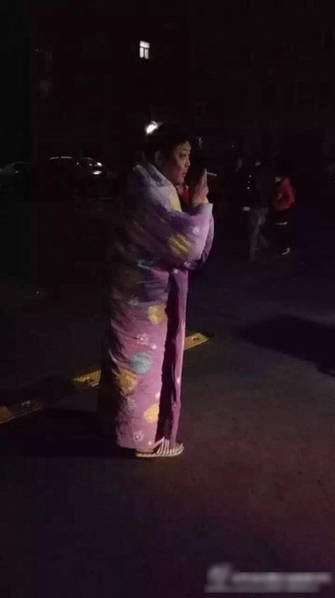 有網(wǎng)友反映,其時(shí)當(dāng)?shù)貞敉鉁囟冗_(dá)零下十四度,許多市民出來避震時(shí)不得不罩著被子。圖為現(xiàn)場(chǎng)災(zāi)民。