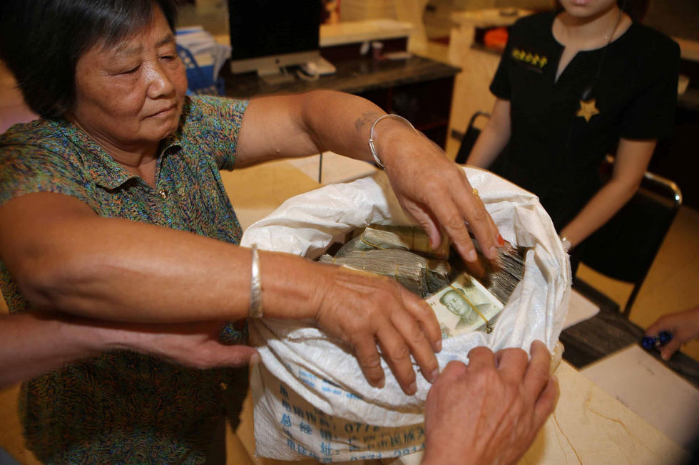 圖為售樓人員數(shù)錢現(xiàn)場。