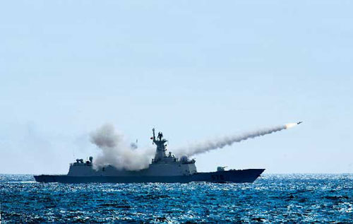 “紅方”護(hù)衛(wèi)艦發(fā)射艦艦導(dǎo)彈(解放軍畫報(bào)圖片)