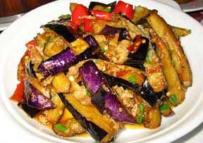 2、加中等偏大量的油, 7、8成熱的時候下鍋翻炒,待到茄子有點(diǎn)軟的時候起鍋。再在鍋中放少量油, 切好蔥姜蒜末暴之,然后放大約二兩左右的肉絲,要大一些,肉片最好,爆炒,熟了以后放茄子,立刻放醬油,少量的水,糖,雞精,鹽,悶之。