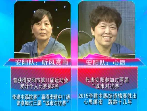 雖然來的是兩名女隊員,但是人家巾幗不讓須眉?!奥狅L賞雨”曾獲得安陽市第11屆運動會雙升個人比賽第2名;2015年“李建中踢館賽”領(lǐng)先李建中11級;參加過三次“河南電視雙升城市對抗賽”?!靶脑浮痹?015年“李建中踢館資格賽”中勝出;代表安陽隊參加過兩屆“河南電視雙升城市對抗賽”,牌齡十幾年。